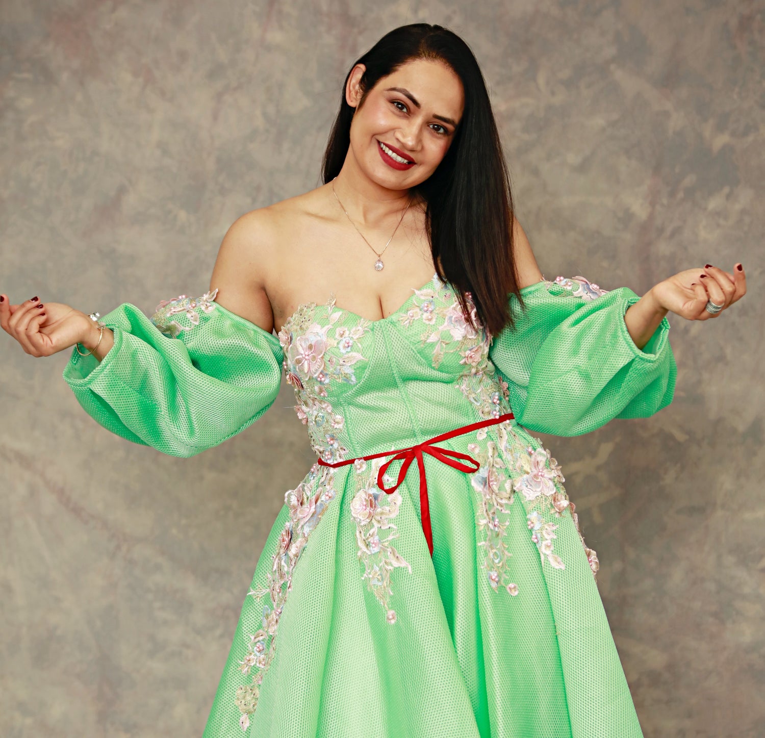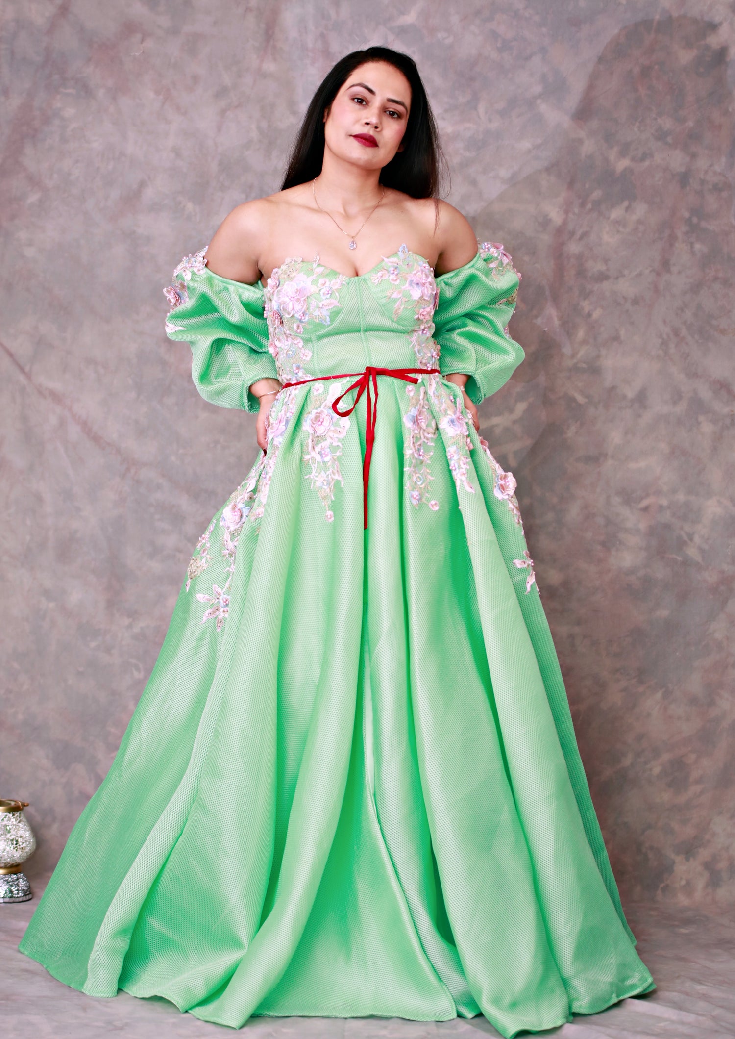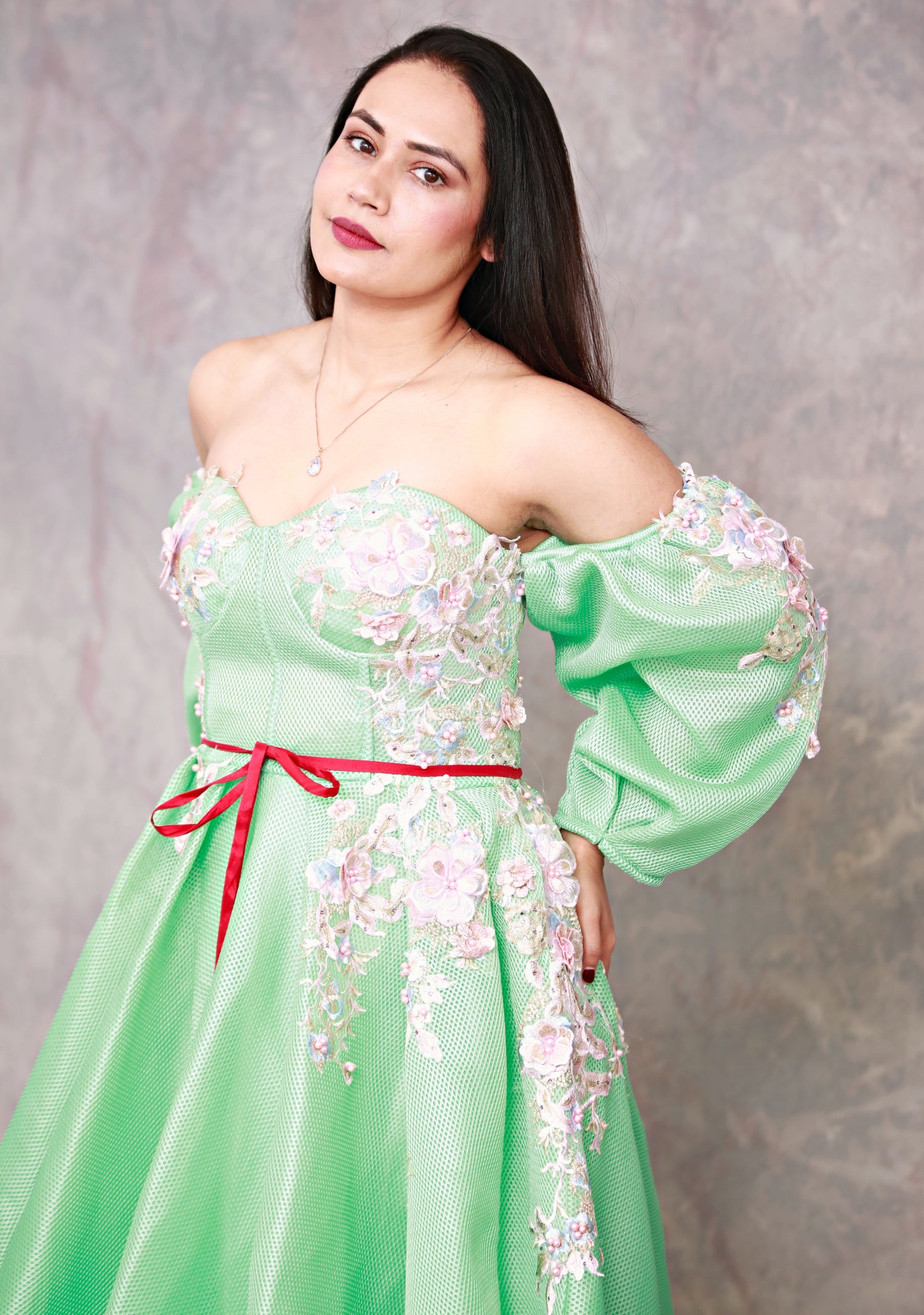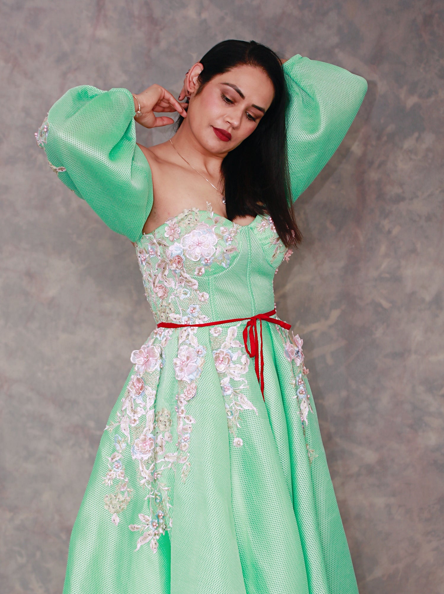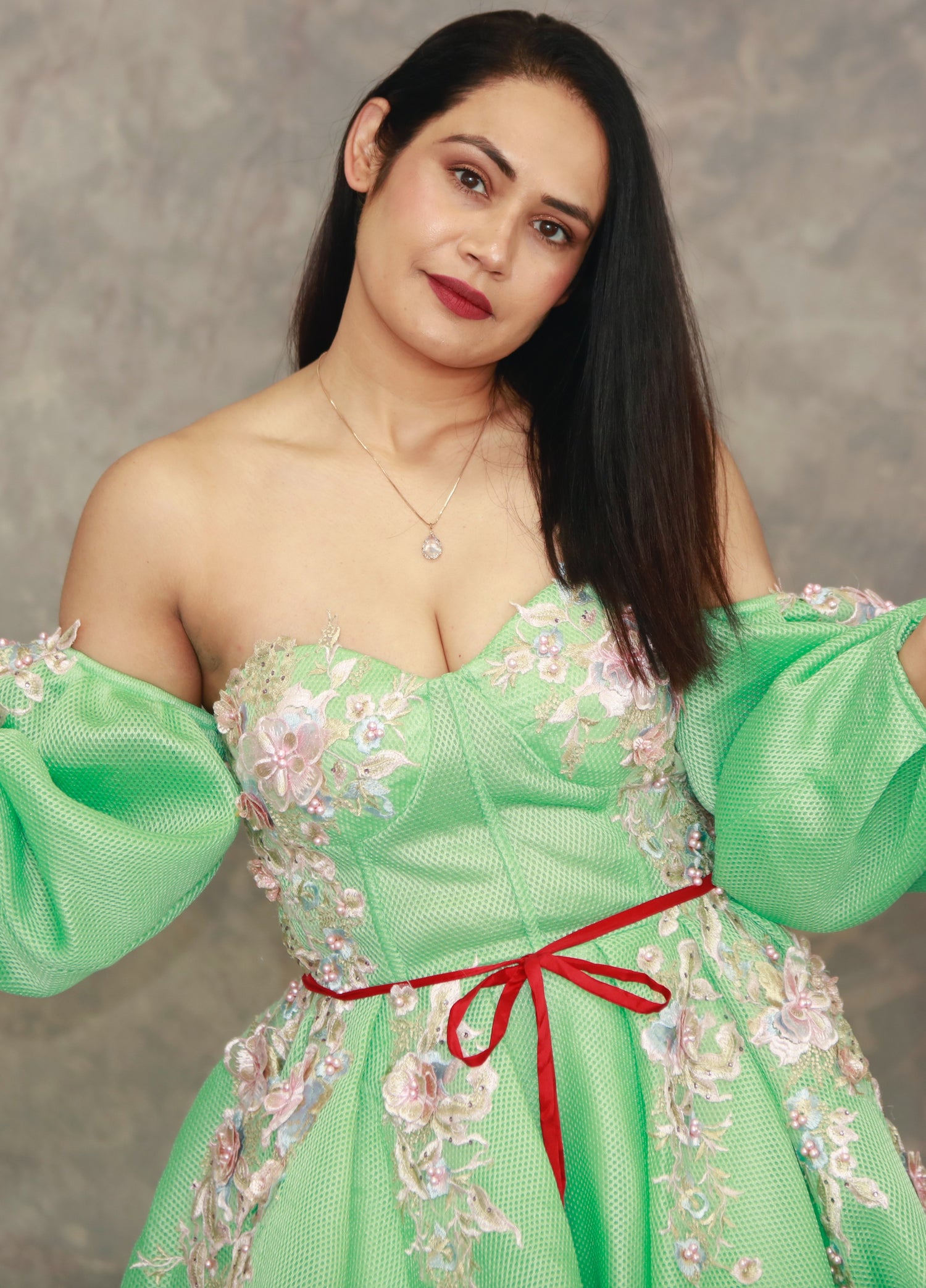 Dress is designed with frilled half arm. Overall dress is emboidered